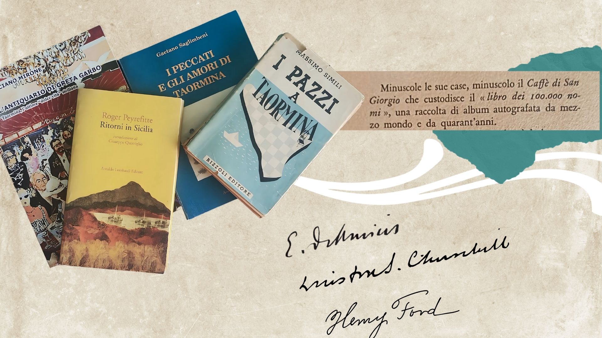 Dell’antico, piccolo caffè, parla Massimo Simili, scrittore e giornalista de ”La Sicilia”, nel libro, del 1947, “I pazzi a Taormina”, dove un capitolo ( il terzo) , intitolato “ Il Libro Dei 100.000 nomi” si diffonde sulle caratteristiche del locale , sulla importanza dei visitatori, sulle firme degli stessi .