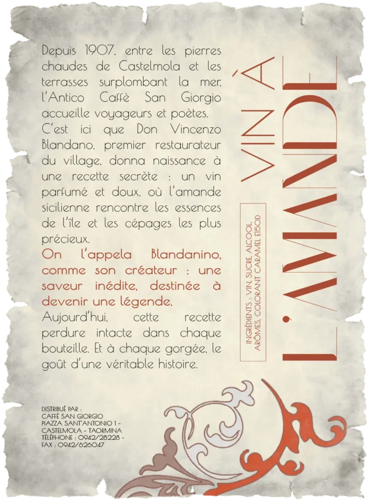 À la même époque, Don Vincenzo eut l’idée de créer un vin de dessert spécial, le vin d’amandes, légèrement sucré car élaboré à partir d’amandes amères. Produit à l’origine sur son domaine de Castelmola, il devint rapidement célèbre et exporté dans le monde entier.